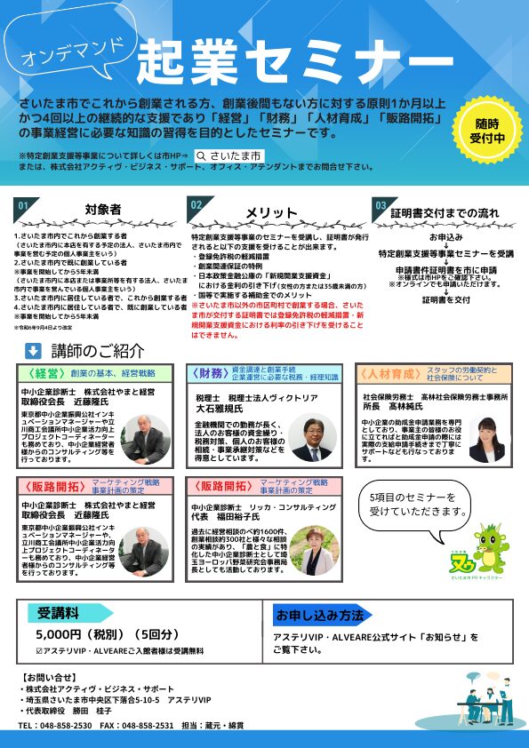 さいたま市内で今後創業する方、さいたま市内で創業後5年未満の方※、さいたま市内に居住している方で今後創業する方、創業後5年未満の方※に対する、原則1か月以上かつ4回以上の継続的な支援であり「経営」「財務」「人材育成」「販路開拓」の事業経営に必要な知識の習得を目的としたセミナーです。